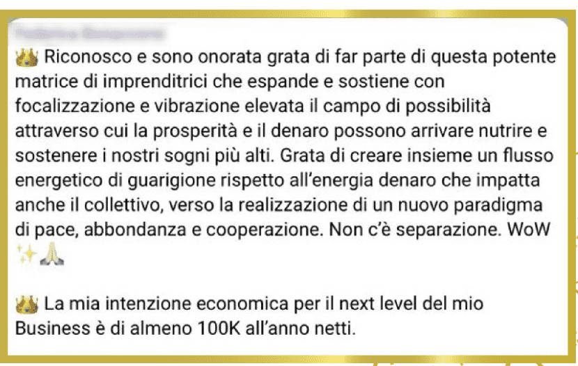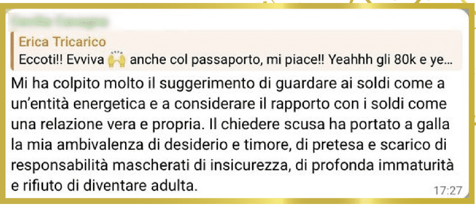 Mi sento abbondante! Ho visto moltiplicarsi le opportunità e le offerte che posso lanciare, valorizzando anni di studio, formazione, esperienza e il mio talento nel combinare competenze in modo creativo. Un’esperienza trasformativa e una delle più preziose del mio percorso di crescita professionale e umana!