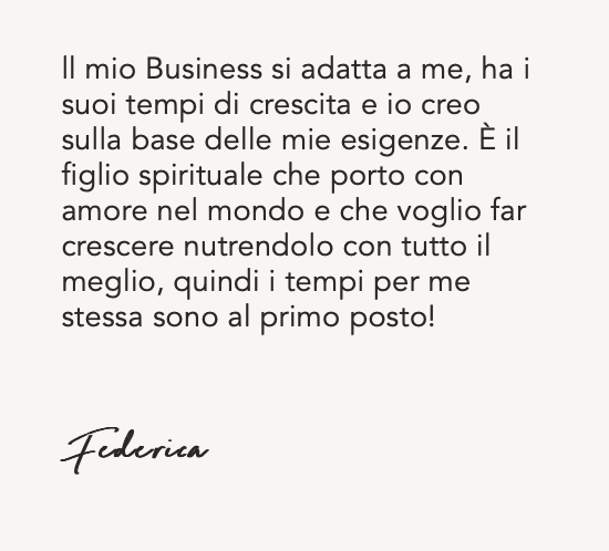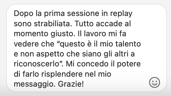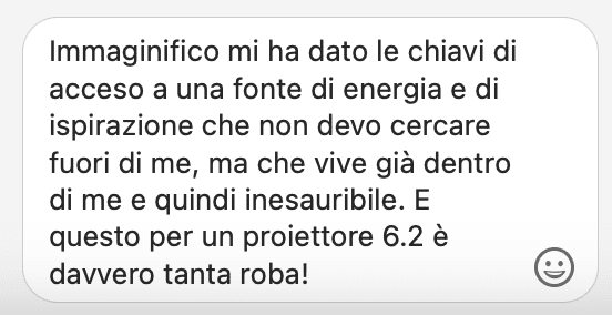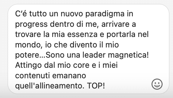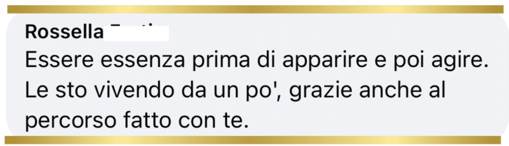 Fare questo percorso è stato come prendere un ascensore che mi ha portato a dialogare direttamente con la mia parte più saggia e ispirata, che è anche la parte più solida ed affidabile su cui posso contare per costruire il progetto di business che desidero realizzare, proprio ora che sono in una fase di rebranding. Il fatto di aver seguito in differita non ha per nulla diminuito l’impatto potente dei contenuti, che ho divorato letteralmente! Se non che me lo sono riascoltato anche tre volte, tanto è denso di “chicche” imperdibili!
