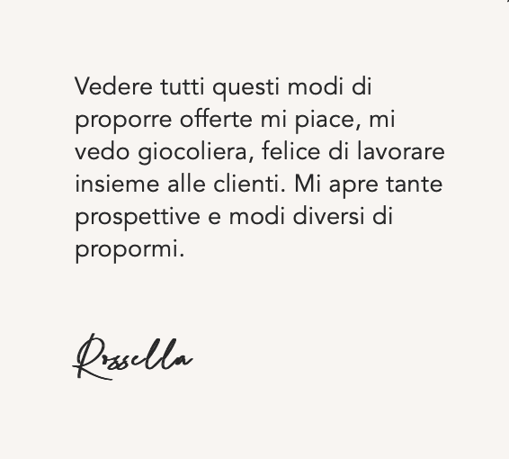 Vedo questo percorso come l'inizio di un processo, il primo passo da cui partire per creare la propria attività imprenditoriale. Infatti adesso andrò a rifare Perla e Essence Atelier. Per continuare vorrei proprio altri strumenti per creare la mia impresa con le sue offerte, il suo programma, e tutto ciò che serve per scalare la vetta!